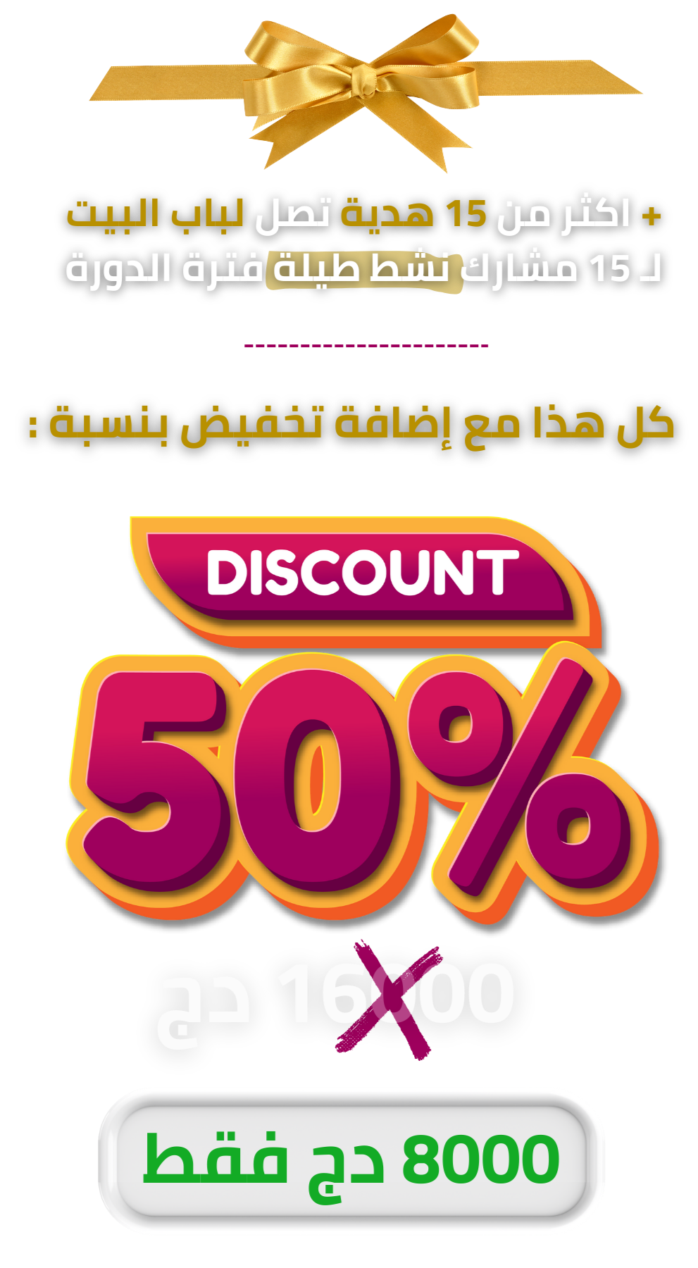 هذه أول دفعة ، ان سجلت فيها ستستفيد من التخفيض . لكن بعد غلق التسجيلات يوم 20 فيفري ، سيعود ثمنها الأصلي و هو : 16000 دج مع غياب الـ الهدايا و المرافقة و لا حتى البثوث المباشرة .